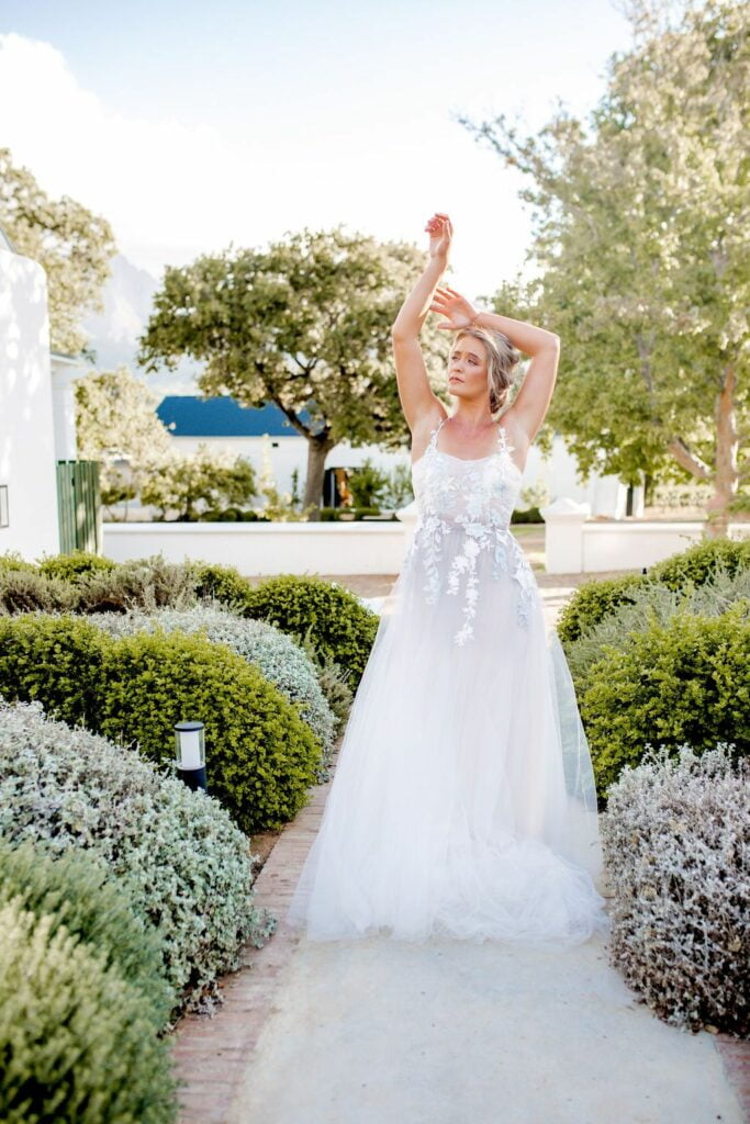 The dress is then embellished with ivory and hand painted bridal lace that trickles down the skirt.